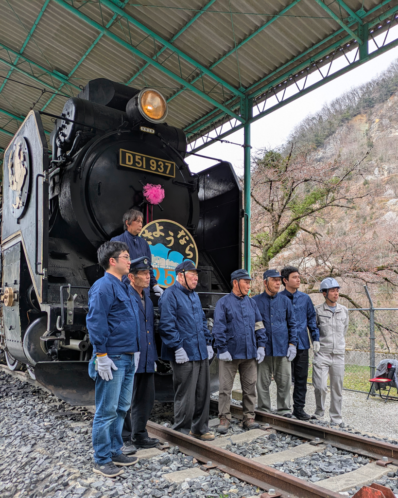 今回のイベントでは最後の運行「さよなら列車」発車前に撮影された写真(写真は新聞記事にてご覧いただけます)が発掘されたことを機に、元国鉄職員の方々、新見市鐡道観光アドバイザー坪内政美様、新見市観光案内所のSLジオラマ制作などに関わった有志の方々により再現された井倉洞のD51とともに、元機関士・元機関助手の皆様が当時の制服で同じポーズでの記念撮影が行われました。会場では関係者の皆様が、過去の資料や写真、最終日に施されたプレートを眺めながら、当時の思い出を昨日のことのように語られている様子に感銘を受けました。