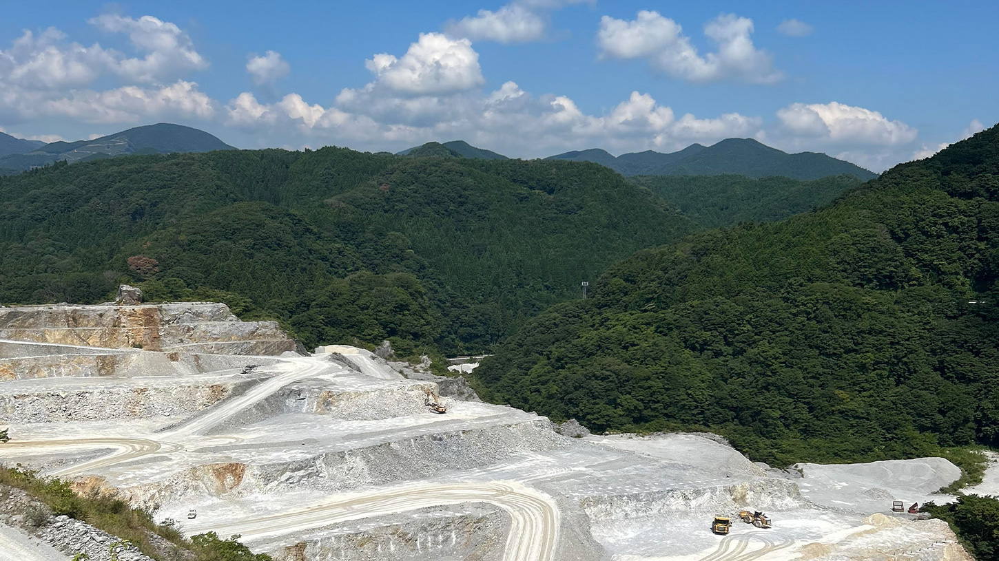 こちらは本号の表紙に使った写真で、弊社石灰鉱山を天気の良い日に高台から撮影したものです。