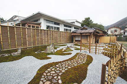 屋内ロビーから眺めることが出来る枯山水は以前、灰色の砕石が敷かれていました。その上に当社の石灰玉石を敷き、丸みを帯びたやわらかさと白さをプラスしました。